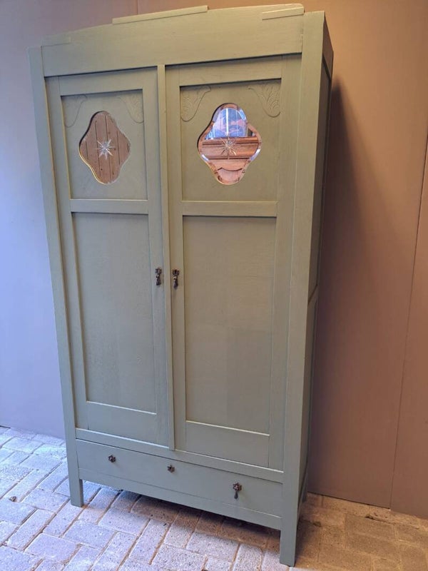 Oude linnenkast , in de kleur lichtgroen. Kleine spiegeltjes in de deuren , de kast sluit goed. Voorzien van verstelbare legplanken en 2 kleine lades. 1 grote lade onderin de kast. de kast biedt genoeg opbergruimte