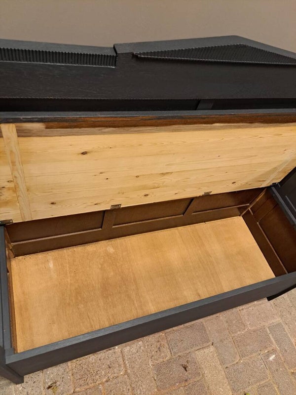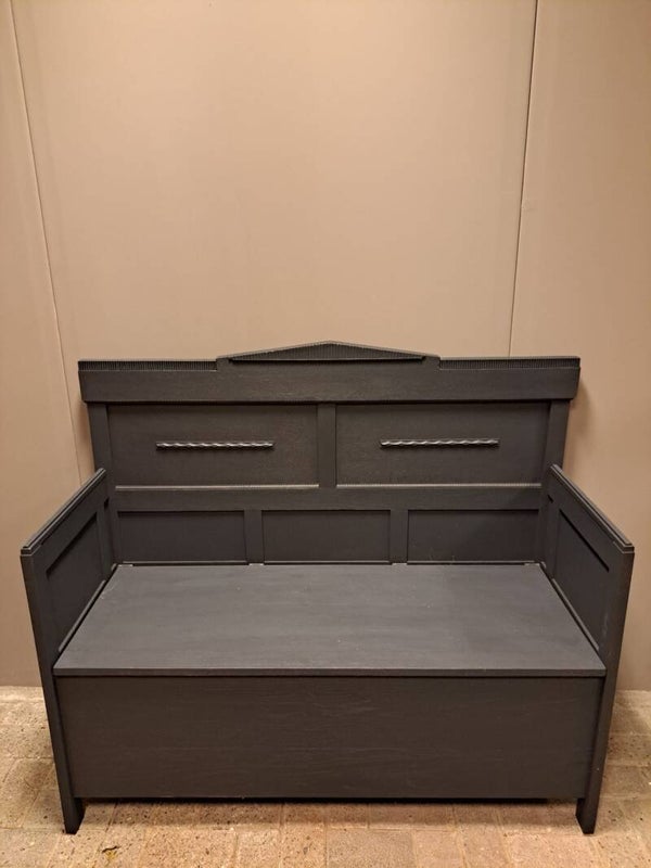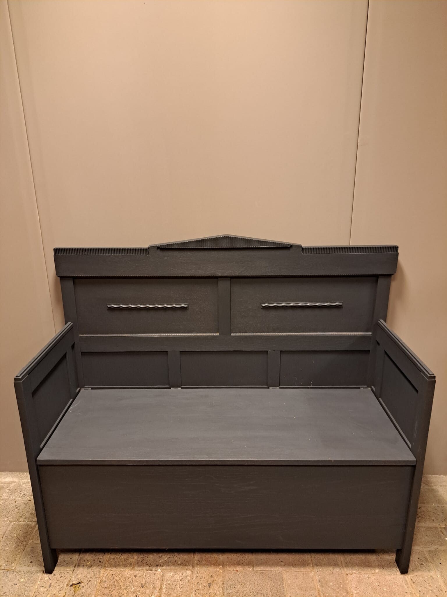 Oud klepbankje , in de kleur antraciet . Het bankje verkeerd in nette staat afgewerkt met mooie sierranden. Veel opbergruimte.
