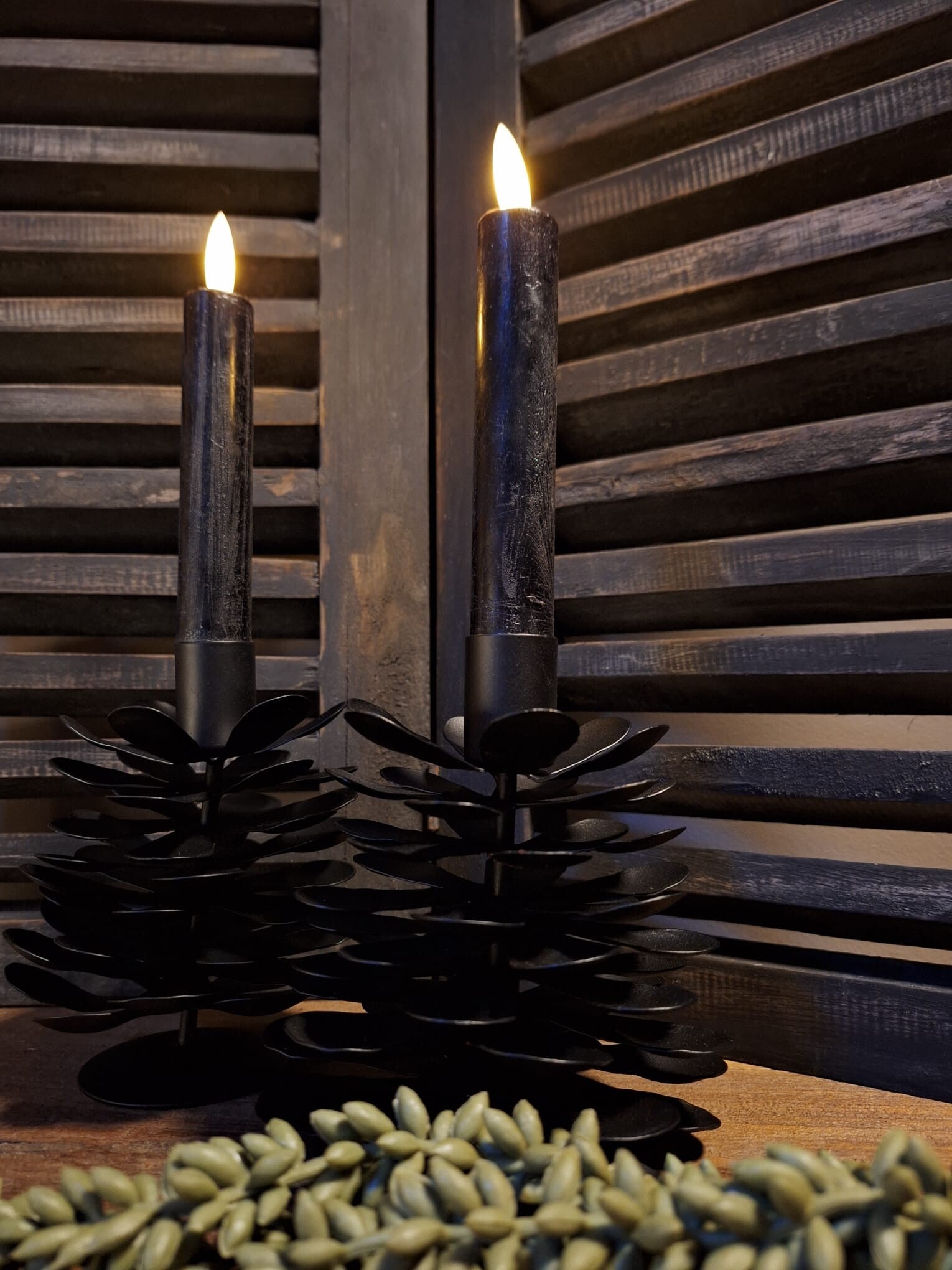 Zwarte metalen kaarsenstander in de vorm van een dennenappel