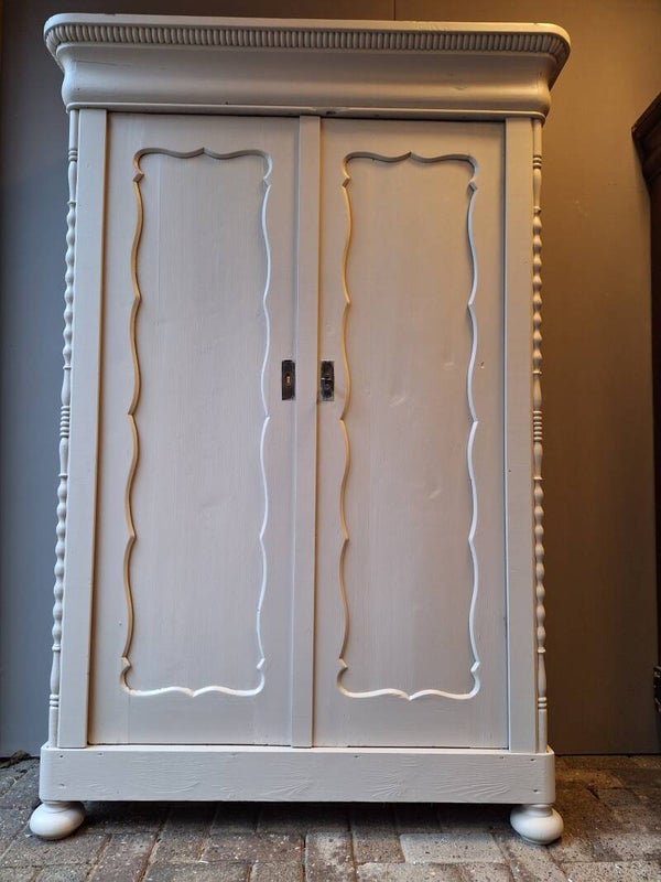 Biedermeier linnenkast in de kleur taupe , De deuren sluiten perfect met een goed werkend slot . De kast is stevig en biedt enorm veel opbergruimte voorzien van legplanken en 2 kleine lades.