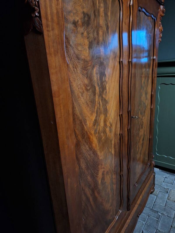 Grote mahonie biedermeier meidenkast , De kast is in originele staat. De kast sluit netjes met een goed werkend slot. De kast is geheel demontabel dus makkelijk te vervoeren. Veel opbergruimte..