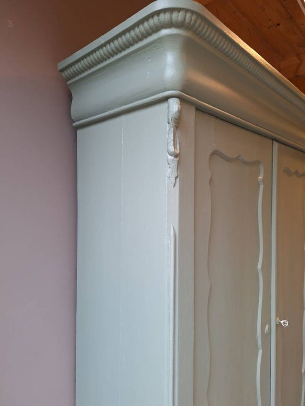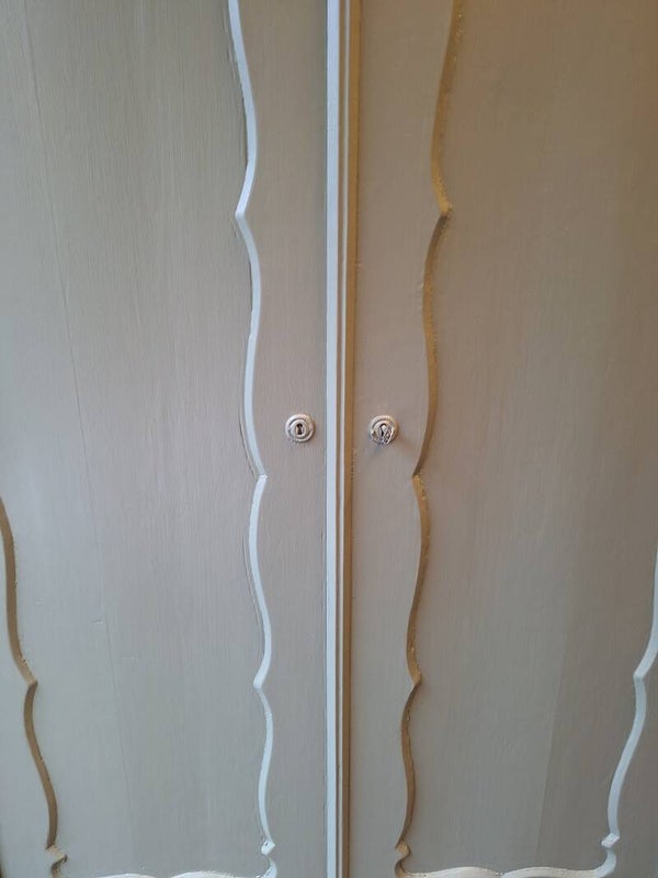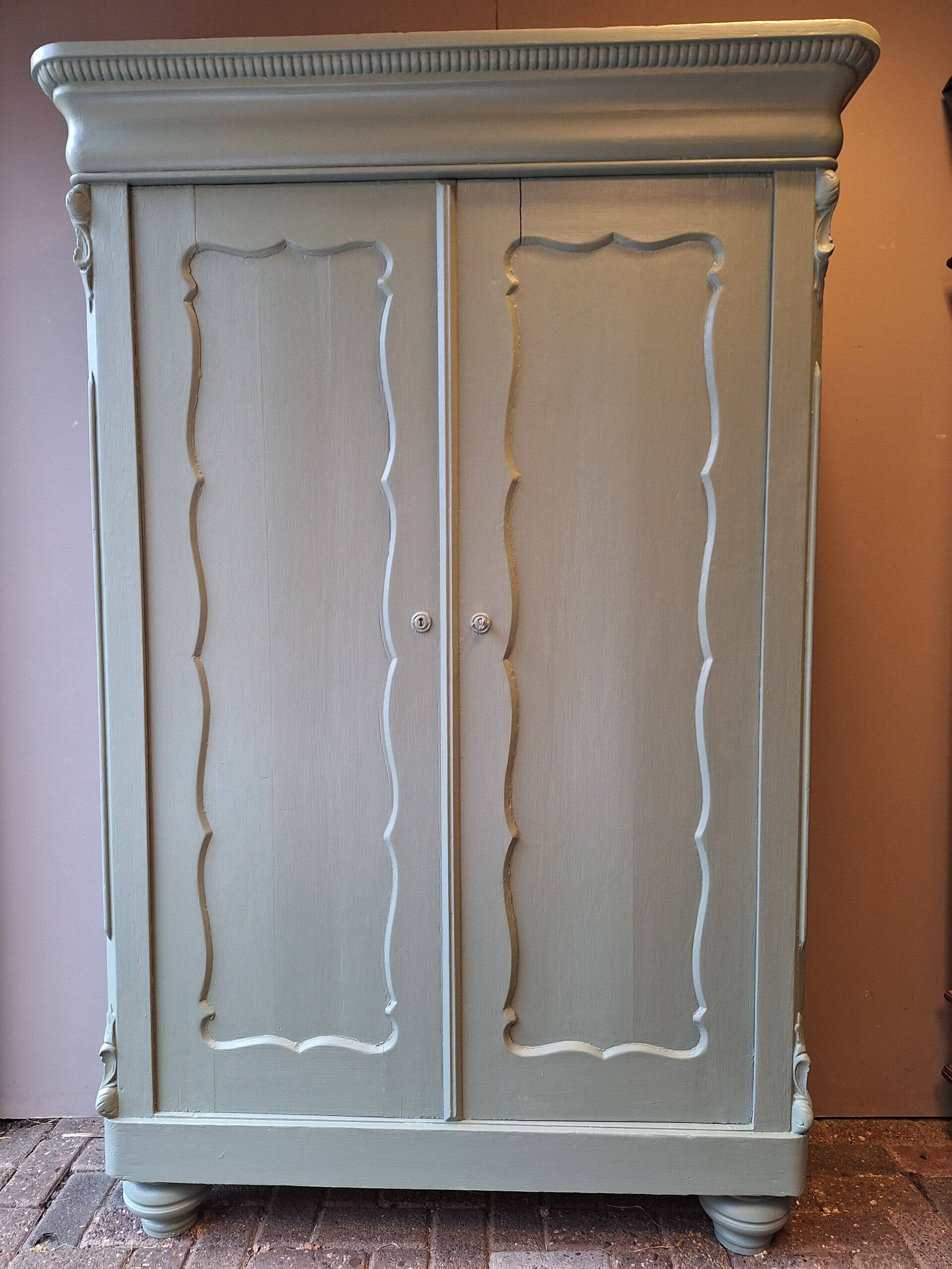 Grote biedermeier meidenkast , in een matte groene kleur . De kast sluit netjes met een goed werkend slot incl. sleutel. Veel opbergruimte.