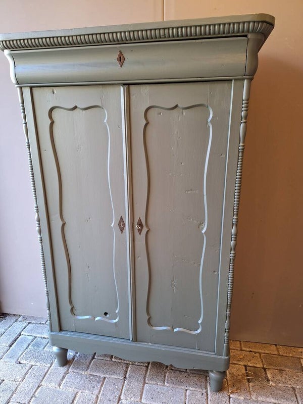 Biedermeier meidenkast , in een groene kleur. De kast sluit netjes met een goed werkend slot incl. sleutel. Voorzien van legplanken , 1 grote lade en kleine haakjes..