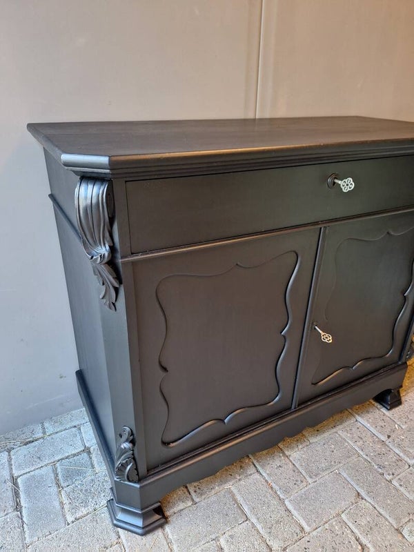 in een mat zwarte kleur. stevige kast , voorzien van genoeg opbergruimte een goed werkend slot zowel in de deuren als in de lade.