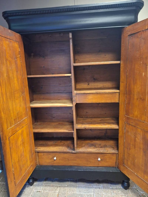 Biedermeier linnenkast , in een mat zwarte kleur . de kast sluit netjes met een goed werkend slot inlc. sleutel. Veel opbergruimte. de kast is gedeeltelijk demontabel daardoor makkelijk te vervoeren