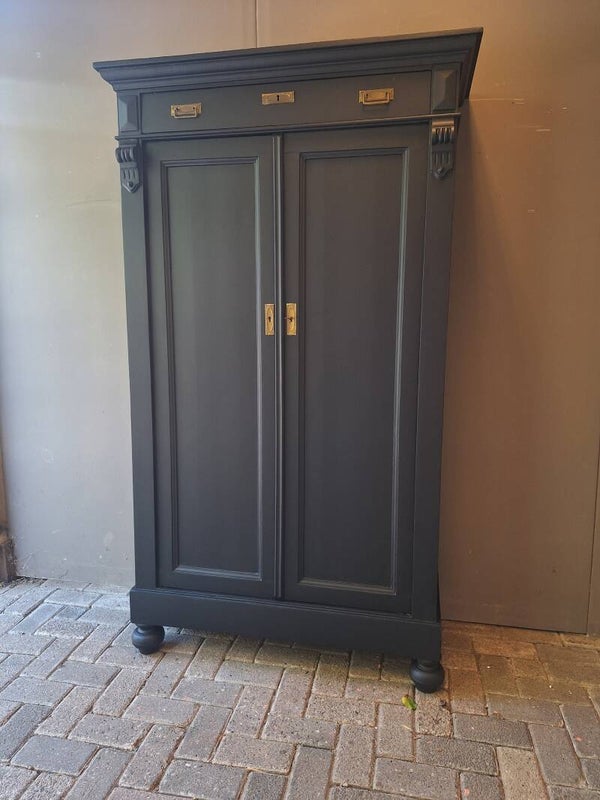 Meidenkast in de kleur mat zwart , de kast sluit netjes met een goed draaiend slot. incl. sleutel. voorzien van legplanken en een lade bovenin de kast