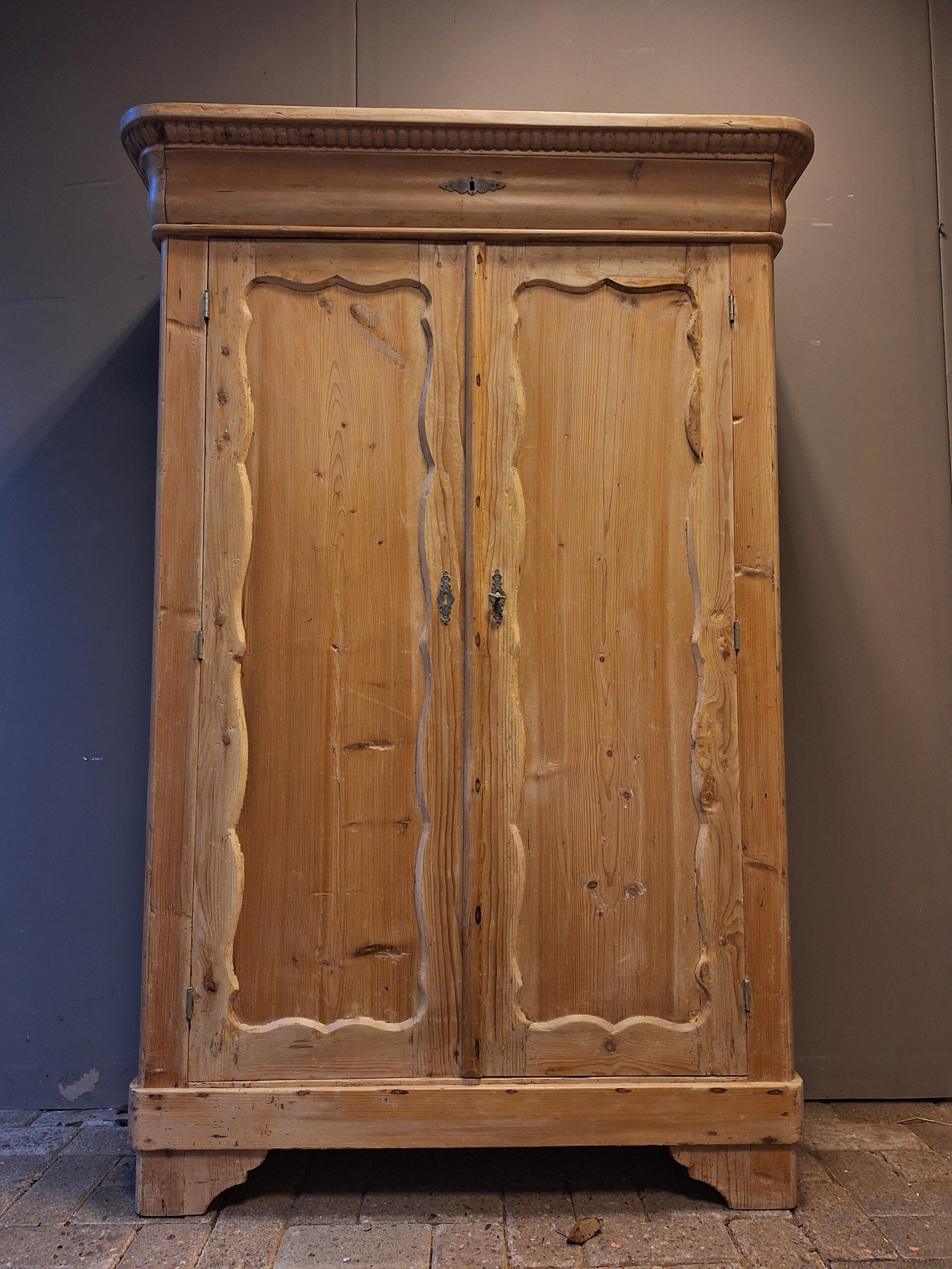 Geloogde biedermeier meidenkast , de kast verkeerd in originele staat. Voorzien van legplanken en 1 grote lade bovenin. De kast sluit netjes met een goeddraaiend slot.