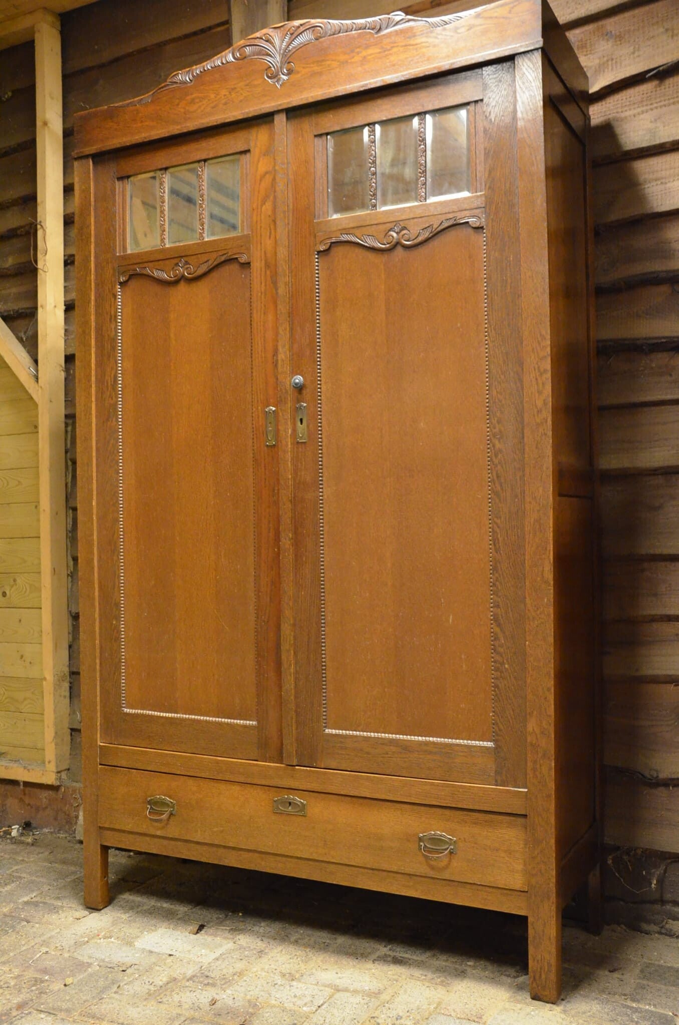 Antieke linnenkast met spiegeltjes in de deuren afgewerkt met sierranden. De kast verkeerd in een zeer nette staat , de deurtjes sluiten goed. Voorzien van verstelbare legplanken en 2 lades